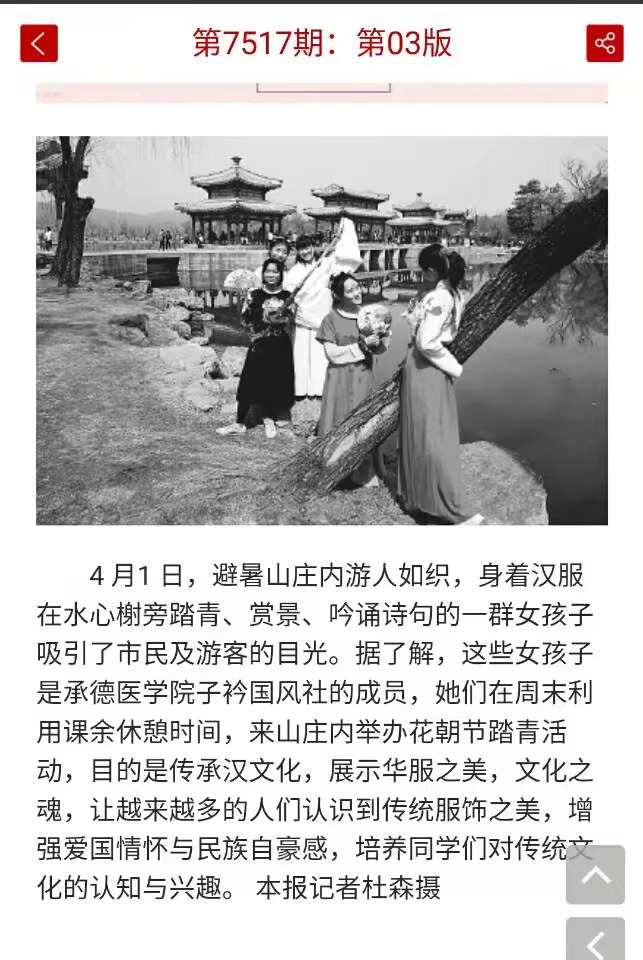2018年3月31日,承德医学院子衿国风社与承德医学院八重雪漫友社在避暑山庄联合举办了以“朝暮逢春”为主题的花朝节踏青活动。