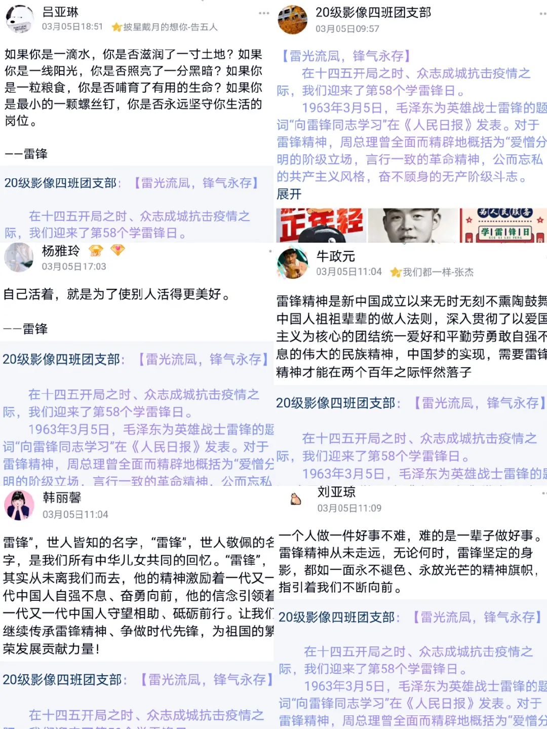 为弘扬“奉献、友爱、互助、进步”的志愿精神,又值3月5日是第58个“学雷锋纪念日”之际,基础医学部2020级影本第四志愿服务队开展了以“雷锋精神我传承,青春闪耀新时代”为主题的志愿者活动,以实际行动书写新时代的雷锋故事,弘扬时代新风气,传播青春正能量。 嘉疫情防控志愿 涨吾辈青年志气 影本第四志愿服务队的17名志愿者,在假期时间积极投入到当地的志愿服务当中,为疫情防控贡献了力量,志愿者们特举办志愿表彰大会,通过对志愿活动的嘉奖,扩大宣传范围,书写着医学生的责任与担当,涨吾辈青年志气! 厚植雷锋精神 传递青春力量 为弘扬雷锋精神和传承中华民族传统美德,志愿者们参与了雷锋精神宣传活动,通过在QQ等平台发布话题,分享雷锋语录、雷锋故事等内容,广泛宣传雷锋精神,用实际行动践行雷锋精神,做新时代的“新雷锋”。 观百年沧桑巨变 树时代青年理想 正值建党百年之际,志愿者们开展班会,普及党史知识,开展宣传教育活动,并利用线上与线下相结合的方式,鼓励志愿者们到当地红色纪念馆打卡,近距离接触红色故事,厚植爱国情怀,在志愿服务中赓续红色精神。 传递精神爱常在 爱老敬老记心间 为更好的关爱老人,以实际行动弘扬志愿精神,志愿者们到当地敬老院,运用医学生的专业知识,为老人们测量血压,并普及防诈骗知识,畅聊生活琐事,用实际行动为老人们送去关怀与祝福,弘扬了爱老敬老精神,营造了良好氛围。 小活动助力冬奥 大心意给予祝福 2022年,第24届冬奥会将在北京举办。身为当代大学生,应该积极宣传冬奥文化,营造喜迎冬奥的良好社会氛围,全体志愿者参与了班级组织的线上冬奥知识竞答,进一步巩固了同志愿者们对于冬奥会的了解,激发了志愿者们的兴趣。同时,还在抖音上发布了以“缤纷纸鹤,纯真祝福”为主题的活动,通过以每一位志愿者拍摄折纸鹤的视频,为冬奥会的举办送上真挚的祝福。 通过此次系列志愿服务活动,志愿们都对雷锋精神有了进一步的了解与认识。学习雷锋精神,不只是口号,更在于用行动去实践,作为当代青年人,志愿者们当以青春之名行青春力量,当从身边小事做起,将雷锋精神永远的传承下去,努力成为社会的中坚力量!