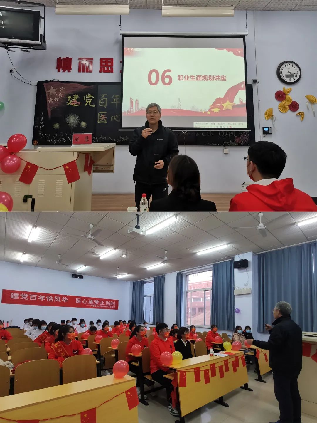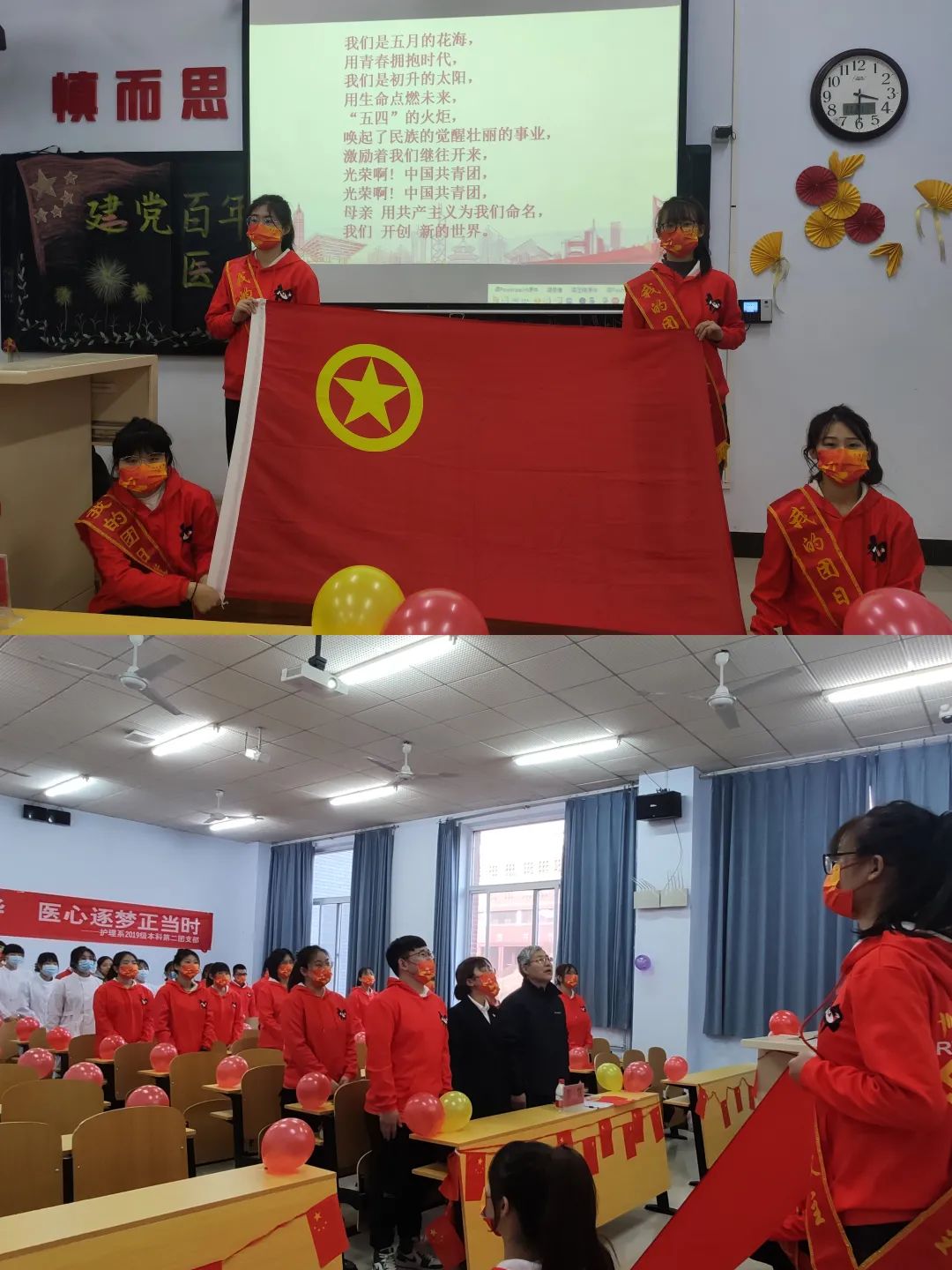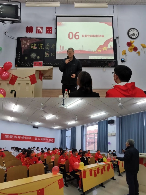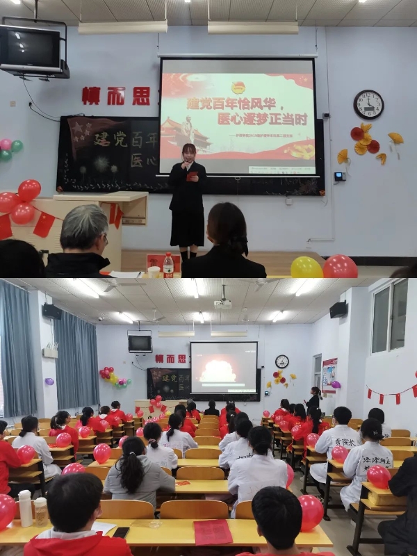 2021年是中国共产党成立100周年,习近平总书记深情寄语新时代中国青年:“以实现中华民族伟大复兴为己任,不负时代,不负韶华,不负党和人民的殷切期望”。为深入学习贯彻习近平总书记“七一”重要讲话精神,推进“不忘初心,牢记使命”主题教育常态化,响应承德医学院培养新型护理人才的号召,11月21日下午四点,护理系19级本科第二团支部在教学楼303教室开展了以“建党百年恰风华,医心逐梦正当时”为主题的团日活动,参与此次活动的有原护理系涉外护理医学教研室主任雷慧老师及团支部全体成员。 活动前期,进行线上调研,对团员们个人规划情况进行问卷调查并统计调查结果。活动开始前,由主持人介绍到场嘉宾,全体团员展团旗合唱团歌,在庄严的团歌声中,此次团日活动拉开帷幕。活动第一项,全体成员观看了视频《百年风华》,百年征程是数不清的艰辛困难,是众多英雄的奋斗征程!视频结束后,团员们纷纷进行发言,表示要把青春奋斗融入党和人民事业,成为实现中华民族伟大复兴的先锋力量。活动第二项,观看团员代表带来的“山河无恙”情景剧表演,让团员们认识到了“生命至上,举国同心,舍生忘死,尊重科学,命运与共”的伟大抗疫精神。活动第三项,介绍前期问卷调查结果,由雷慧老师为团员们进行职业生涯规划讲座,雷慧老师分别从就业、考研等方面为团员进行讲解,团员们对今后的职业生涯有了新的认识,坚定了个人信念。最后,活动结束,全体人员合影留念。 此次团日活动,通过线上调研、线下活动开展以及职业生涯规划讲座,不仅让团员们深入学习了习近平总书记“七一”重要讲话精神,领悟建党百年伟大历程,同时将伟大抗疫精神内化于团员们的价值追求和道德信仰,为团员们今后的职业生涯奠定了坚实的基础,点燃团员们把小我融入大我,把青春献给祖国的奋斗激情,为党和国家的健康事业提供源源不断的新生力量,为实现中华民族的伟大复兴保驾护航。