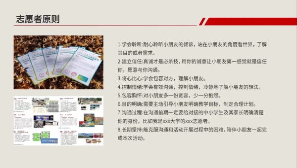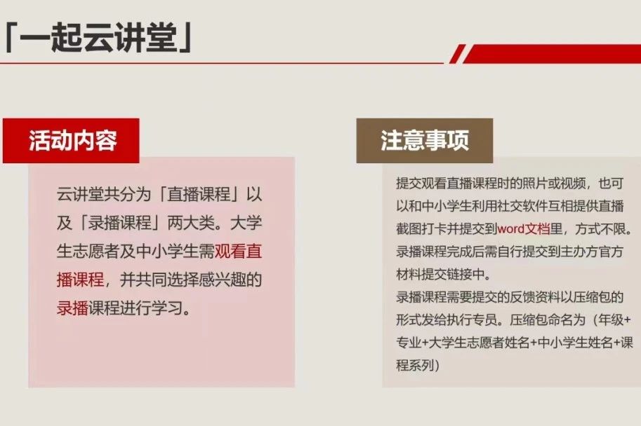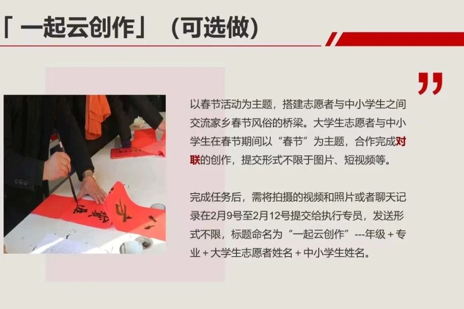 活动讲解 2024年1月25日,大学生志愿服务中心召开了“一起云支教——传承优秀文化,赓续中华文脉”志愿者动员大会。本次大会由领队张佳怡主持,志愿者和执行团队全员参加。 动员大会分为四部分:活动讲解、志愿者原则、志愿者答疑与结语。本次活动包括“一起快乐阅读”“一起健康运动”“一起云讲堂”“一起云研学”“一起云创作”和“我为家乡上上分”六大内容。领队对以上六个内容进行详细讲解,明确每项内容的具体任务,强调志愿者需重视与中小学生及其家长的沟通方式和态度。 志愿者原则及答疑 针对志愿者的活动规范,领队给出以下建议:学会聆听、建立信任、将心比心、沟通过程、长期坚持。这一环节使志愿者更加明确了自己的责任。云支教动员大会中志愿者们积极互动,踊跃提问,领队张佳怡同学针对上述问题一一进行了解答,使同学们对于活动流程和要求有了进一步了解。 会议总结 会议最后,领队张佳怡对志愿者们表达了期许,鼓励志愿者们乘风破浪、克服困难,并预祝志愿者们能顺利完成活动,助力中小学生快乐成长,至此承德医学院大学生志愿者动员大会正式结束。 2024年1月26日,云支教负责人方贻意老师主持“一起云支教——传承优秀文化,赓续文化血脉” 启动会议并邀请指导老师代表对志愿者进行培训,与志愿者们交流经验。本次会议邀请了指导老师代表、志愿者代表和领队代表讲话,为志愿者提供新思路,助力活动顺利进行。 活动流程 培训会主要对活动流程中的细节进行了讲解,包括高校报名、志愿者培训、活动时间等。同时,指导老师强调了活动的公益性和陪伴性,希望志愿者有责任心,尽量避免中途退出。会议还请到了同济大学的学生杨于泽分享经验,并特别邀请了同济大学领队进行详细讲解。最后,会议提醒志愿者在提交材料时要按时保质保量,避免出现提交不及时影响评先评优等情况。 结语 “一起云支教——传承优秀文化,赓续中华文脉”寒假社会实践活动即将拉开帷幕。在本次活动中,中小学生与大学生志愿者将携手共进,期待大学生志愿者们与中小学生共同进步,收获成长,度过一个充实有意义的寒假,同时也祝愿本次云支教活动圆满完成。