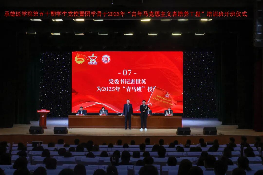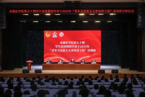 2025年10月23日,正值党的二十届四中全会胜利闭幕之际,承德医学院第五十期学生党校暨团学骨干2025年“青年马克思主义者培养工程”培训班开班仪式在我校会堂举行。我校党委书记唐世英,党委常委、副校长王瑞婷出席仪式,相关职能部门负责人,各院(系)党委(总支)副书记,校团委全体人员,教师团干部以及本期学生党校、校青马班800余名学员参加培训。