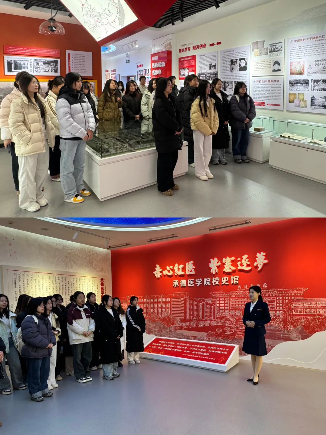活动伊始,团员们走进校史馆开启了“时光长廊,足迹追寻”之旅,在讲解员的引领下,循着一幅幅老照片与一件件实物展品重温学校峥嵘岁月。讲解员结合了校史沿革,生动讲述了学校在人才培养、科研创新、医疗服务等方面的辉煌成就与感人故事,让团员们直观地感受到了母校深耕医学教育、守护人民健康的八秩初心。