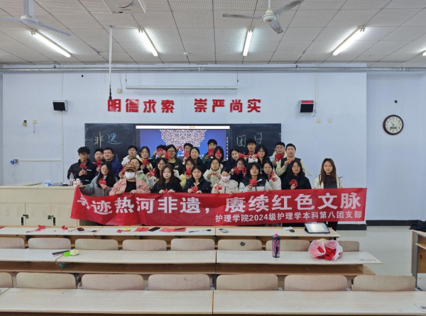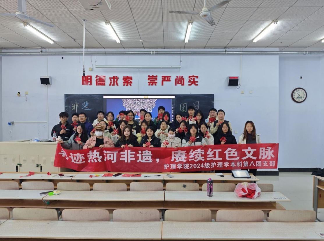 指尖传艺,践非遗匠心 剪纸实践活动中,团员们亲身体验了承德剪纸的创作过程。大家手持剪刀与红纸,专注于每一次裁剪、每一处细节,深刻体会到非遗“代代相传、匠心坚守”的发展历程。同时,团员们将剪纸实践中“精准操作、耐心细致”的要求与护理专业学习相联系,在实践中树立起文化传承的自觉意识,实现了非遗实践精神与护理专业素养的深度融合。