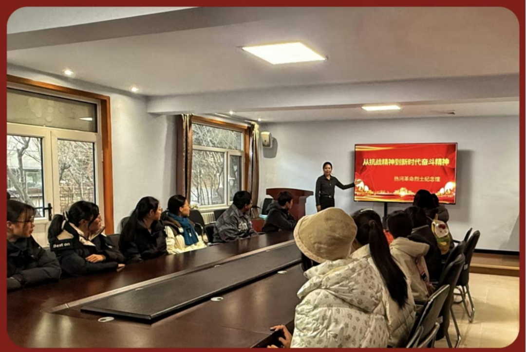三、研史践行,矢志不渝 参观展厅后,团员们移步至纪念馆内的会议厅。这里氛围庄重而沉静,讲解员结合刚才的实地参观,进行了系统的总结梳理。她再次串联起了黑白照片中的关键场景与遗物背后的精神内核,从热河革命的战略价值,到日军暴行带来的历史警示,再到革命先辈用鲜血铸就的民族精神,层层深入地解读了这段历史对当下的深刻启示。她强调,这些珍贵的照片与遗物,是历史的直接见证,提醒着团员们永远铭记苦难、缅怀先烈;而这段抗争史所凝聚的不屈意志,更应成为团员们前行的精神动力。会议厅内的阵阵回响,让此前参观中的零散感悟得以沉淀升华,也让红色基因在心中扎根得更为牢固。