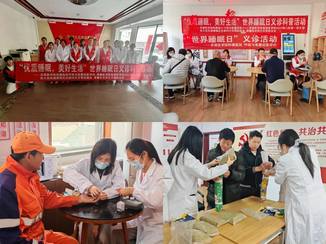 活动二:“优质睡眠,美好生活”世界睡眠日义诊科普活动 3月21日,团支部联合了承德医学院附属医院呼吸与危重症医学科,在碧园社区开展了以“优质睡眠,美好生活”为主题的义诊科普活动。医院专家为居民提供了睡眠问题咨询、健康评估与专业诊疗建议;团员们发放了睡眠科普宣传单,帮助居民进行了血糖测量,并协助医院专家开展了健康服务,组织居民们参与了DIY艾草颈椎枕、健康签名等活动,用贴心服务普及了睡眠知识,切实为群众健康需求办实事。