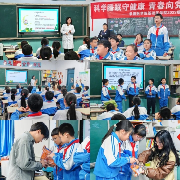 为响应国家的《“健康中国2030”规划纲要》号召,普及科学睡眠健康知识,引领青年团员践行初心使命,承德医学院基础医学院2023级口腔医学第一团支部于2026年3月19日至3月22日开展了以“科学睡眠守健康,青春向党践初心”为主题的系列团日活动。 活动一:“科学睡眠进校园,童心守护好眠梦” 小学科普宣讲活动3月19日,团支部走进了承德市避暑山庄小学,面向五年级学生开展了睡眠健康科普宣讲。团员们运用卡通课件、动画视频等趣味形式,讲解了世界睡眠日知识、小学生适宜睡眠时长,以及睡眠对生长发育、学习效率的重要作用。现场设置了知识问答、互动游戏等环节,以轻松活泼的方式引导了孩子们树立早睡早起、规律作息的健康习惯,用青春力量守护青少年健康成长。
