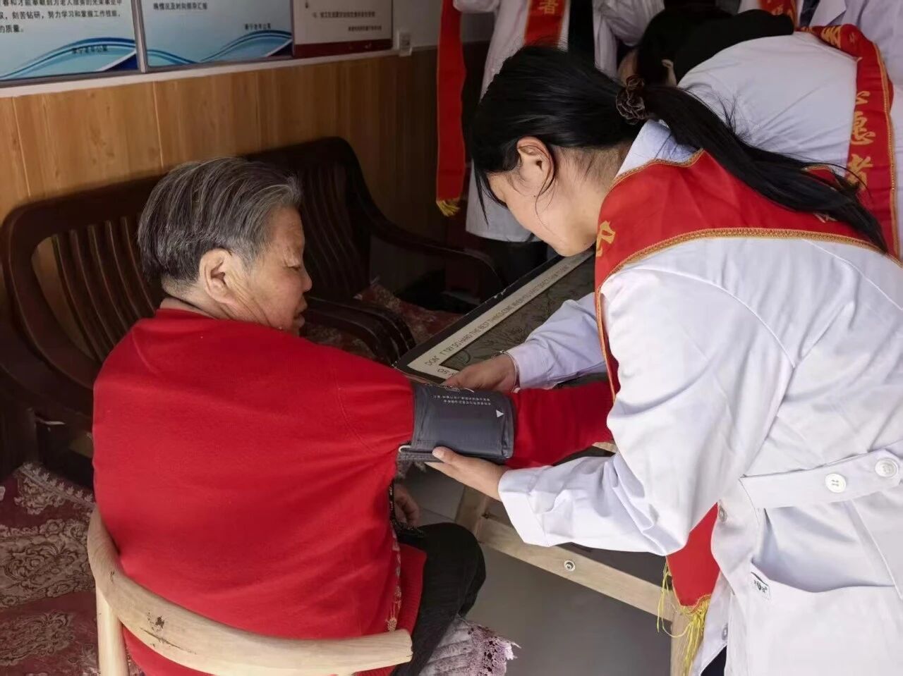 在核心的健康服务环节,团员分组为老人们逐一测量了血压,耐心地记录了每一位老人的血压数据,针对血压异常的老人,还细致讲解了注意事项,同时用通俗的语言开展了血压科普讲解,让老人们清晰了解了自身健康状况。服务之余,团员与老人亲切交流,在互动中深化了对老年护理工作的认知与感悟。